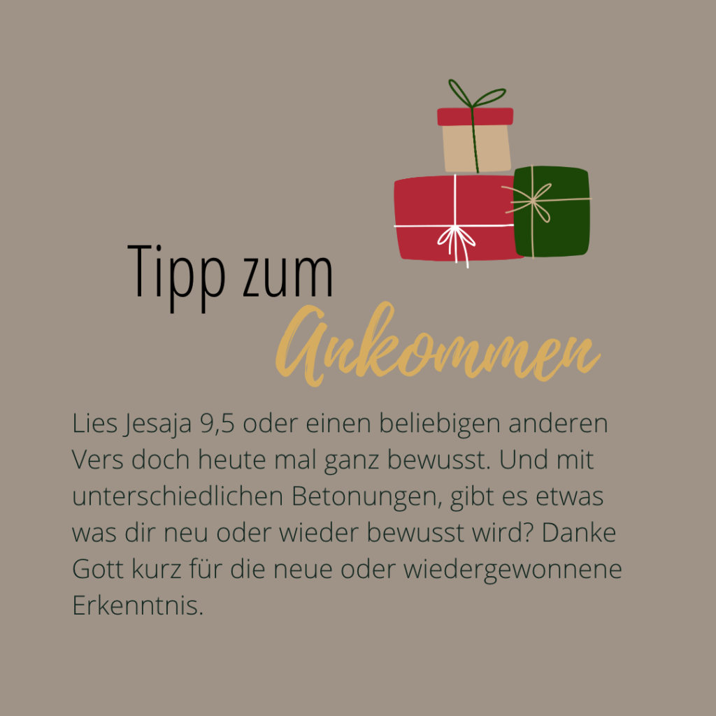 Du brauchst Inspiration? Es gibt verschiedene Bibelverse, die einfach in die Weihnachtszeit gehören. Für mich gehört beispielsweise Jesaja 9,5 dazu. Aber natürlich kannst du auch einen anderen beliebigen Vers nehmen.
