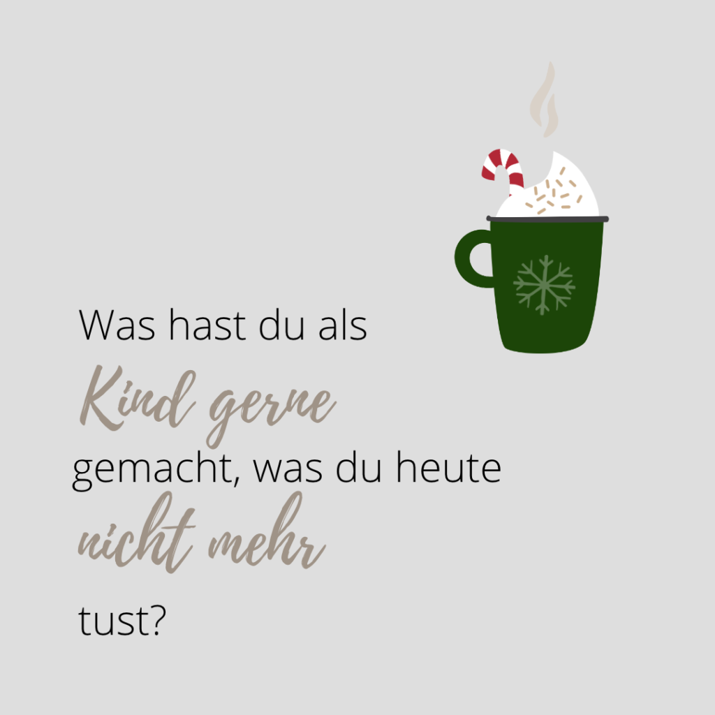 Kannst du dich noch als Weihnachten in deiner Kindheit erinnern? Was hast du damals gerne gemacht, was du heute nicht mehr tust? Wieso tust du das nicht mehr? Denkst du nicht die Zeit dafür zu haben? Oder hindert dich der Gedanke: Was denken die anderen? Oder glaubst du vielleicht sogar es nicht wert zu sein?
