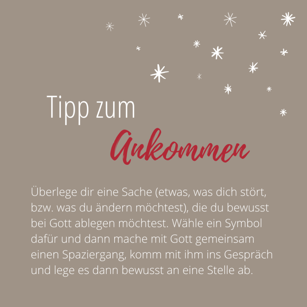 Da die Adventszeit ebenfalls das Ende eines Jahres einläutet, ist es ebenfalls eine Zeit des Reflektierens. Als ich im Sommer in Norwegen auf einem Retreat war, da lud uns der Leiter am Tag vor unserer Abreise ein, doch einmal zu überlegen, was wir in Norwegen lassen wollen. Wir sollten am Anfang eines Spaziergangs ein Symbol für diese Sache sammeln und sie während eines Spaziergangs ganz bewusst in der Hand halten und die Eigenschaften des gewählten Objekts wahrnehmen. Dieses Objekt konnte ein Stein, ein Zweig oder irgendein anderer Gegenstand aus der Natur sein, bei der Wahl sollten wir uns einfach vom Heiligen Geist leiten lassen. Diesen Gegenstand sollten wir dann an einem gewählten Zielort ablegen. Leider konnte ich diesen Spaziergang aus gesundheitlichen Gründen nicht mitmachen, aber die Idee ist mir in Gedanken geblieben und ich habe mir vorgenommen es jetzt in der Adventszeit zum Jahresabschluss umzusetzen. Dieses Jahr hat mich wirklich herausgefordert und am liebsten würde ich das ganze Jahr ablegen und ein neues haben.
